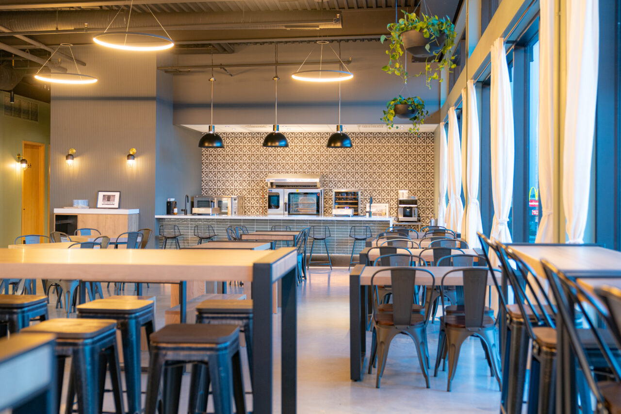 EPIC Market is a two-level food hall at the heart of Station Park, designed as a social hub that brings together dining, gathering, and city views in a single cohesive space. The architectural design emphasizes openness and connection, with expansive windows framing the Edmonton skyline and allowing natural light to shape the experience throughout the day.