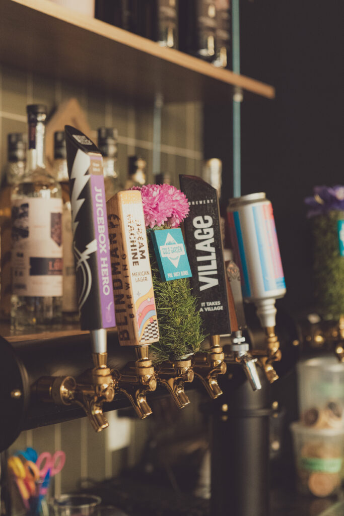 A key feature of the space is its strong indoor-outdoor relationship. The upper-level patio opens to views over Whyte Avenue and the downtown core, with string lighting and wood decking creating a casual, comfortable environment.