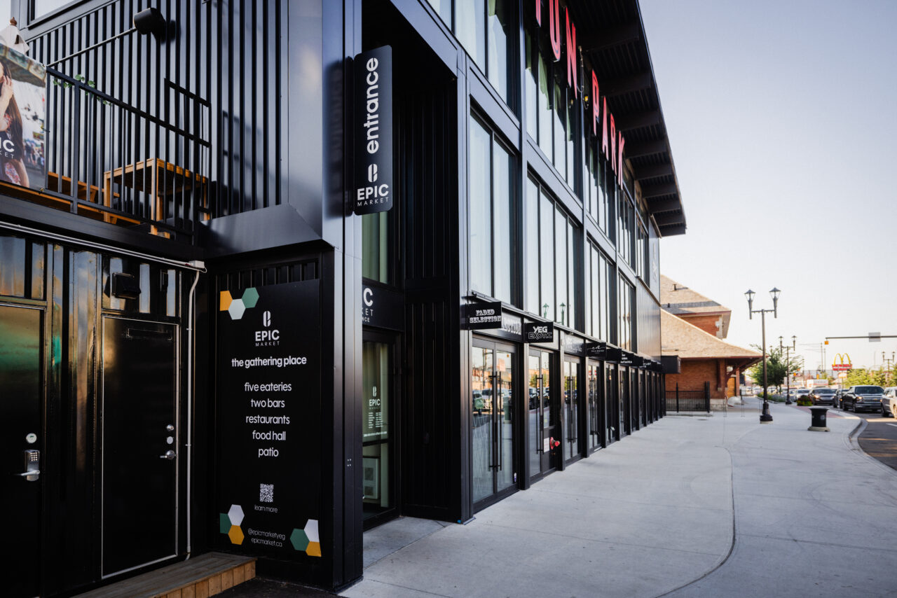 Immediately south sits the historic Strathcona CPR Station, a designated heritage building once known as the “end of steel” and the arrival point for many early newcomers. The redevelopment reconnects this landmark to Whyte Avenue through a new pedestrian pathway that leads from a gateway entrance into a central plaza.