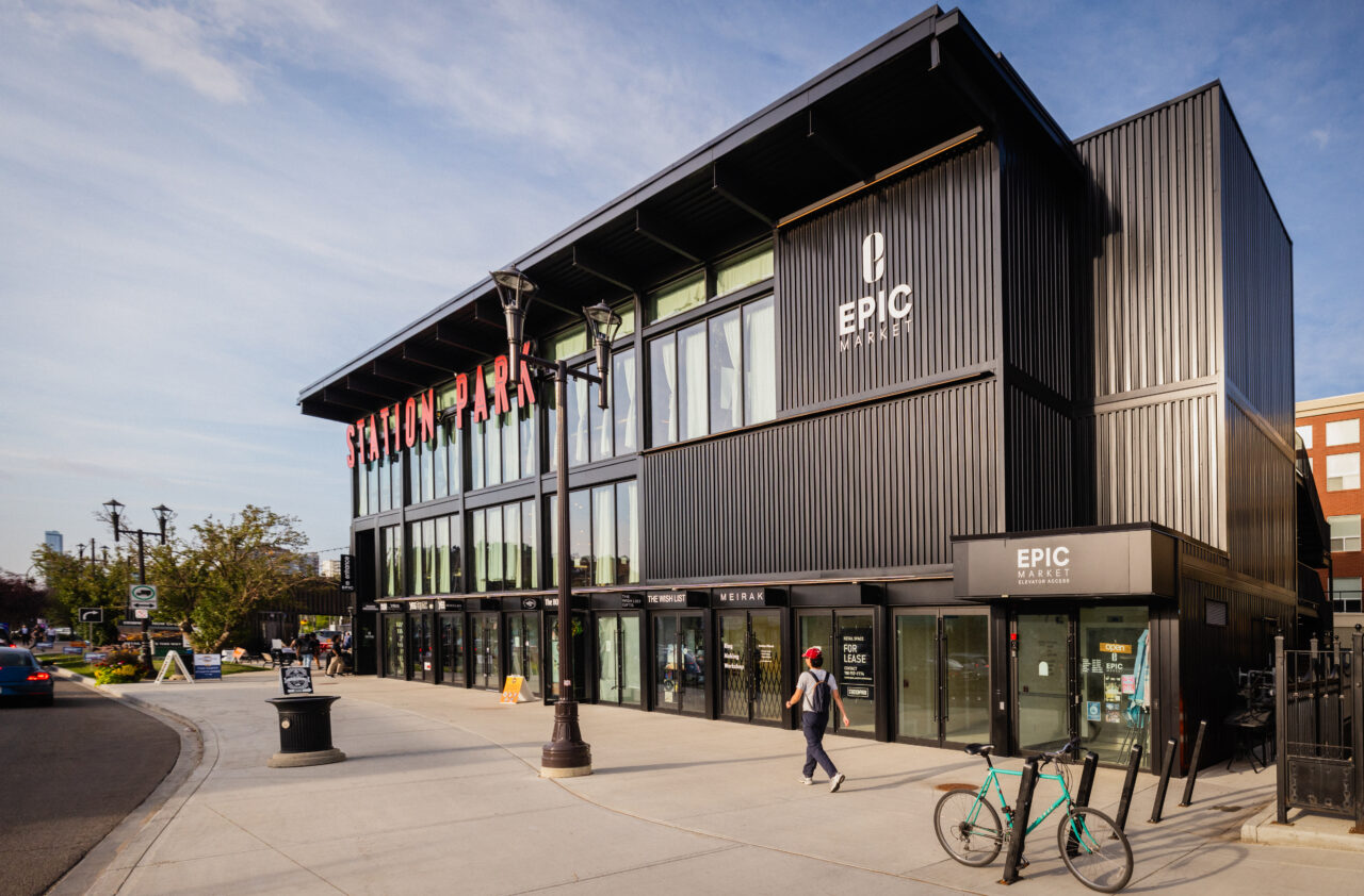 Set back to preserve sightlines, it extends the industrial aesthetic: ground-floor micro-retail, a second-floor food hall with patio views to downtown, and a third-floor event space, accessed via two entrances along Gateway Boulevard.