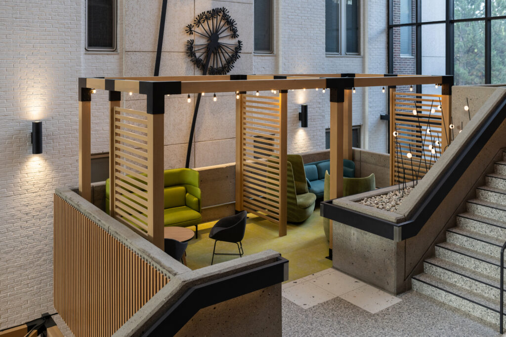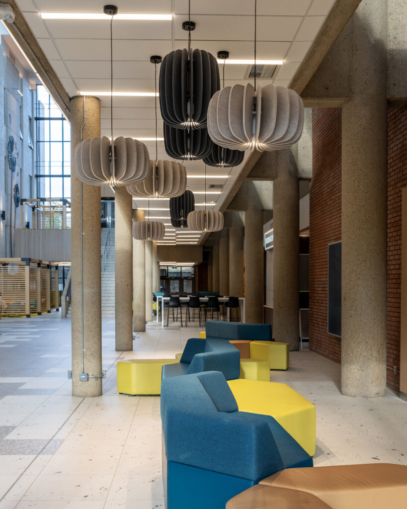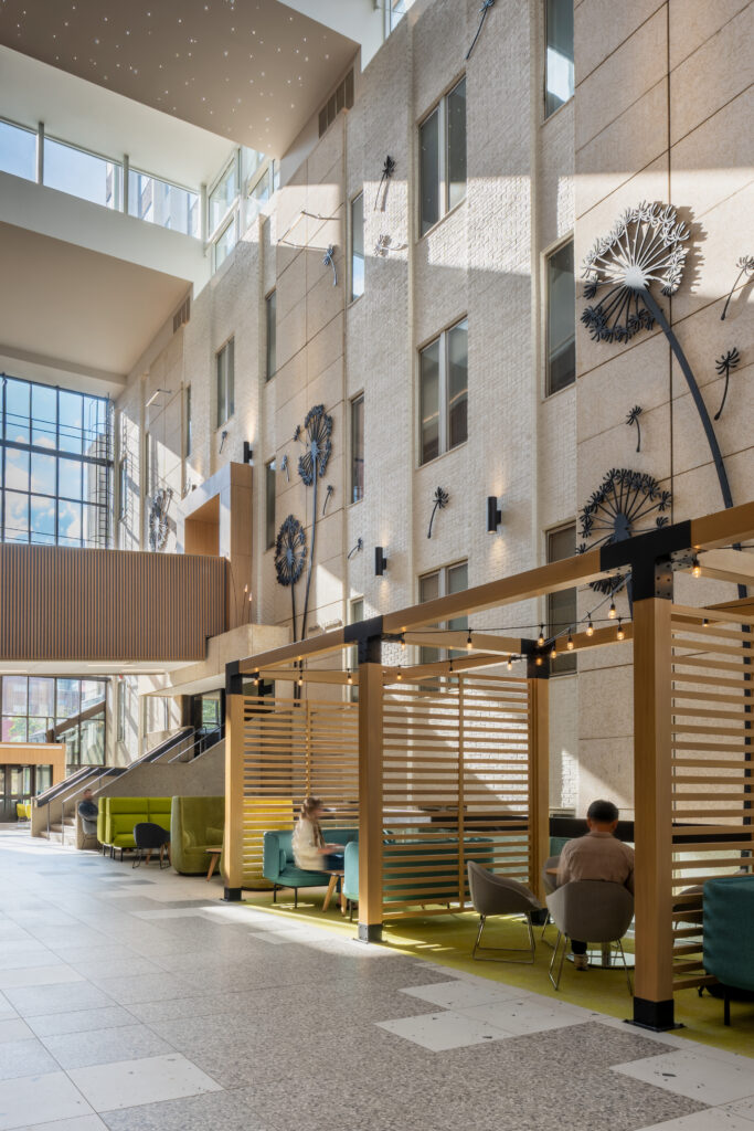 The redesign played on the fact that the interior space was once exterior, so a ‘wintergarden’ theme with a patio vibe was considered appropriate. This included introducing a new structure with east-, west-, and north-facing clerestory windows to maximize daylight. The dark brick of the Tory Building was painted white, creating a brighter atmosphere, and adorned with enlarged dandelion appliqués—suggesting trees swaying in a “winter garden.” Seating pods with structural elements were added to provide human scale, complemented by modular furniture for flexible arrangements. Natural wood accents softened the concrete, creating warmth and texture.