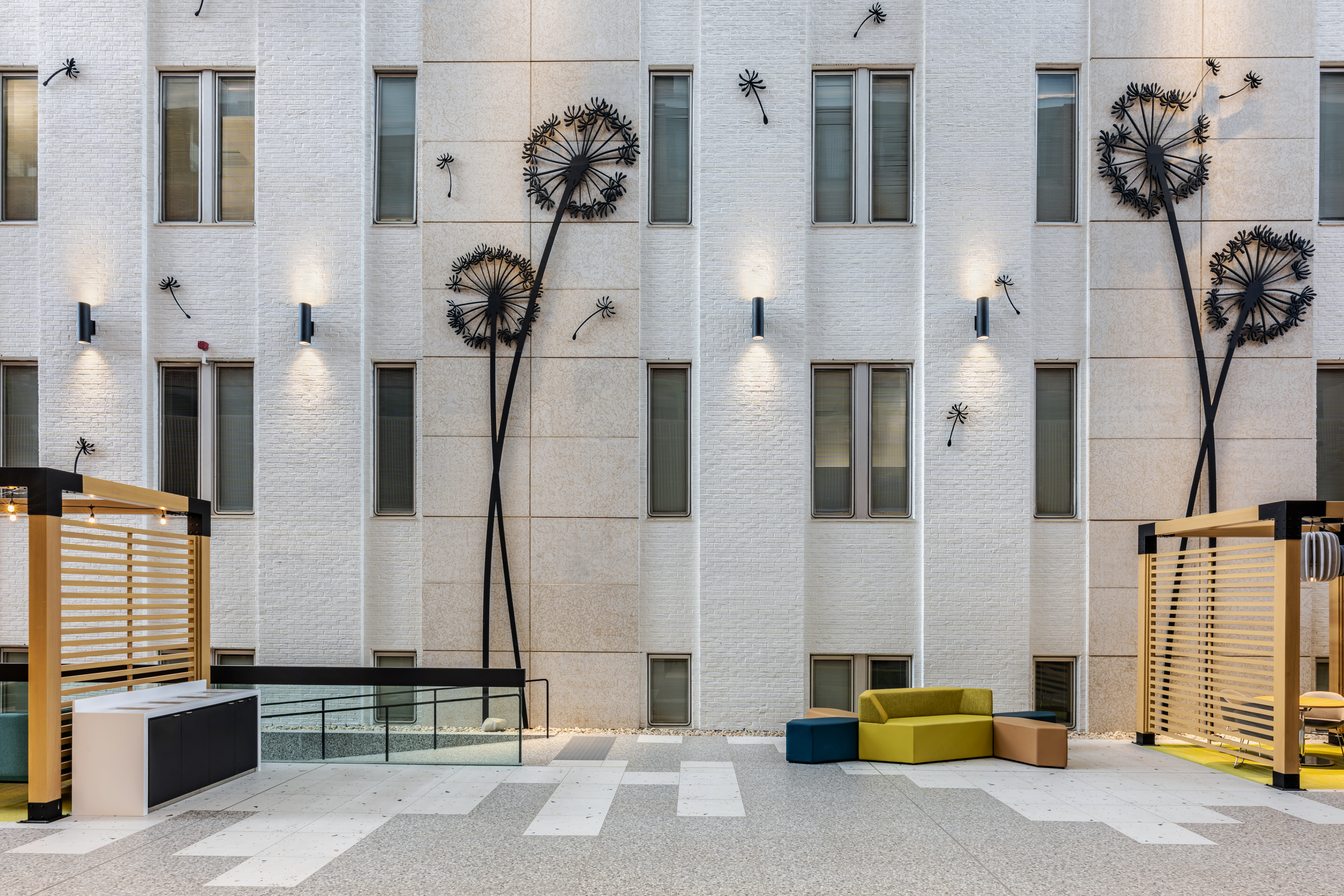 Lighting played a central role in redefining the space. Previously dark and uninviting, the area was illuminated with pedestrian-scale fixtures highlighting the feature wall, ceiling uplighting, and twinkling LED “starry night” effects for an airy, almost magical quality. Delicate lighting sculptures and string lights added a whimsical touch, enhancing the sense of place.